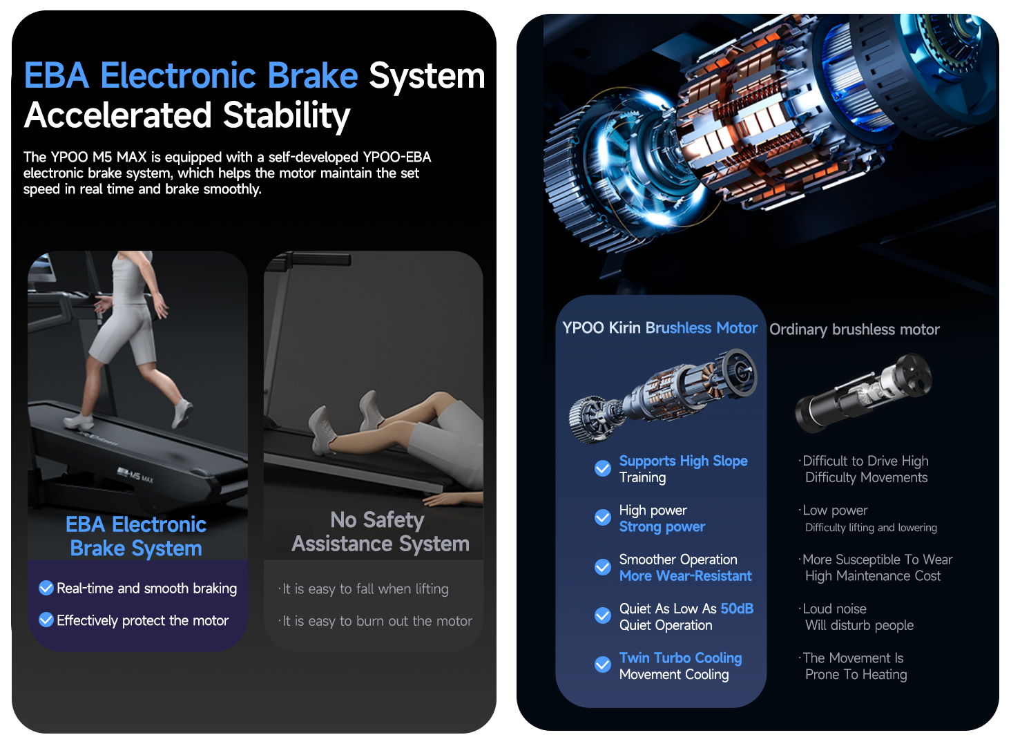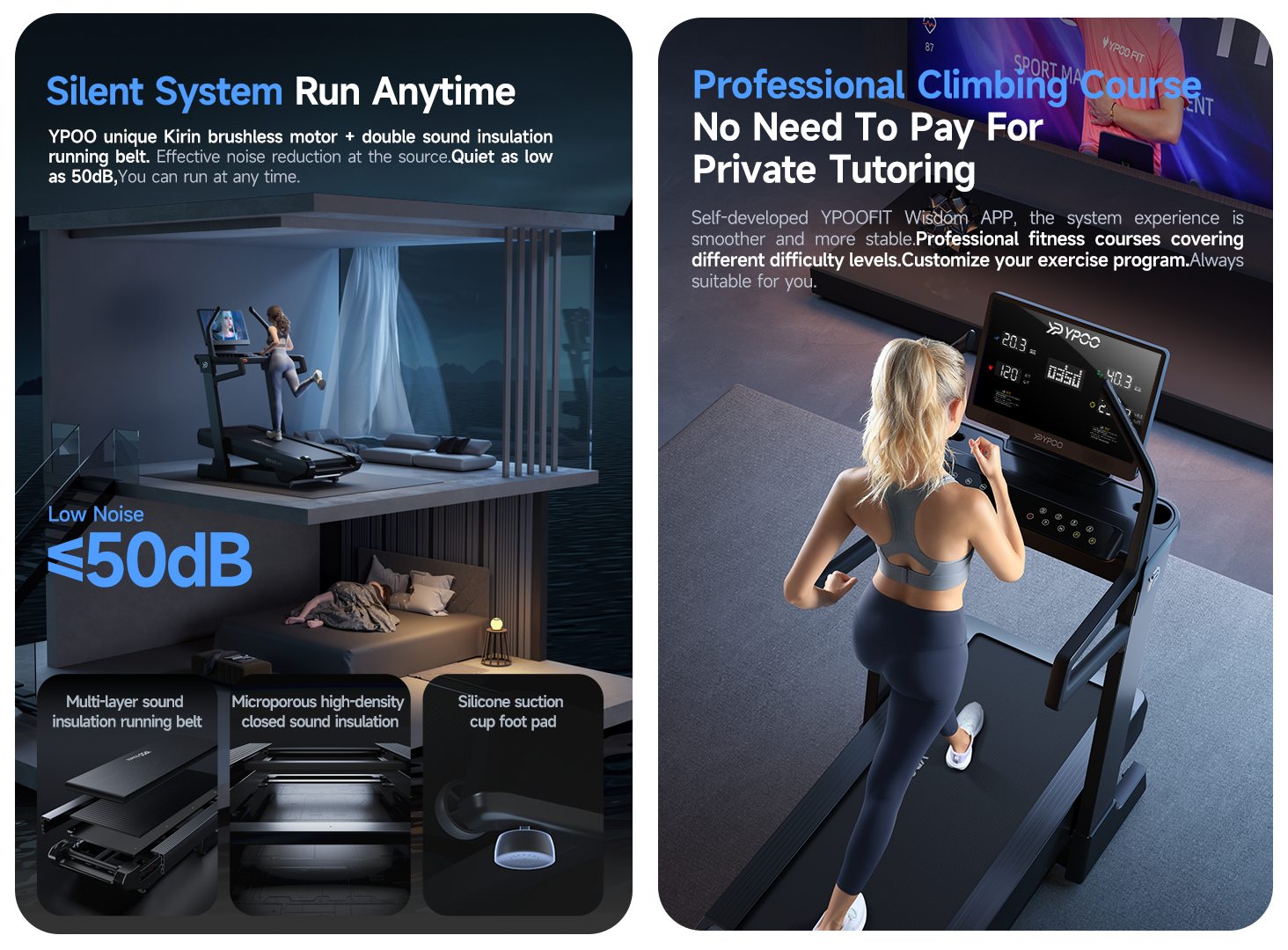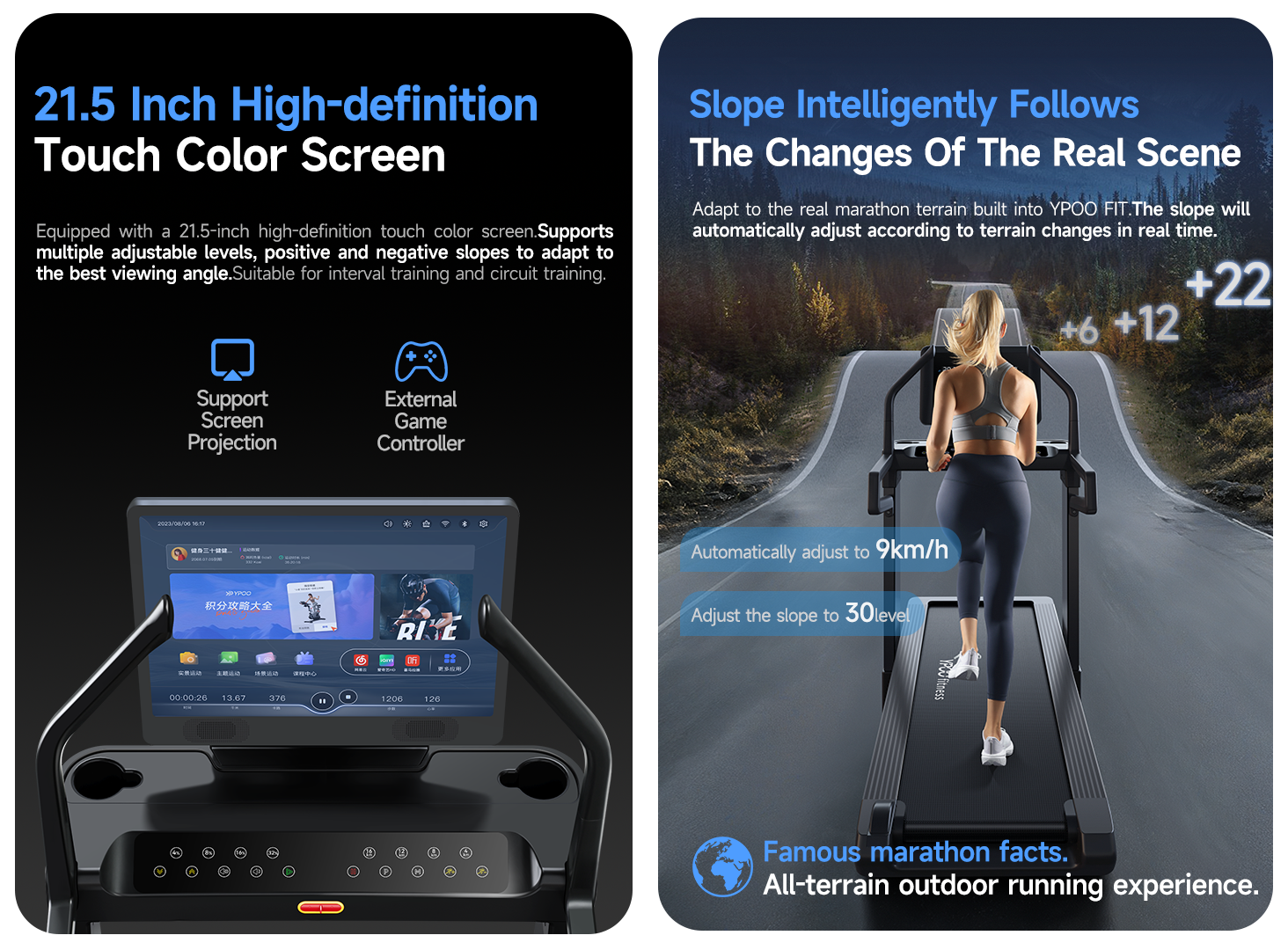 Marathon M5 MAX سير جري شبه تجاري بميل إلكتروني -6% إلى +22% (46 مستوى)، سرعة 18.8 كم/س، شاشة TFT 21.5″، تشغيل هادئ ≤50dB، تحمّل 150 كجم، وتكامل كامل مع تطبيق YPOOFIT.